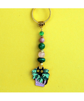 Porte-clefs Chat noirPorte-clefs Chat noir en Malachite, Quartz rose, Jade Rhodonite et Oeil de chat